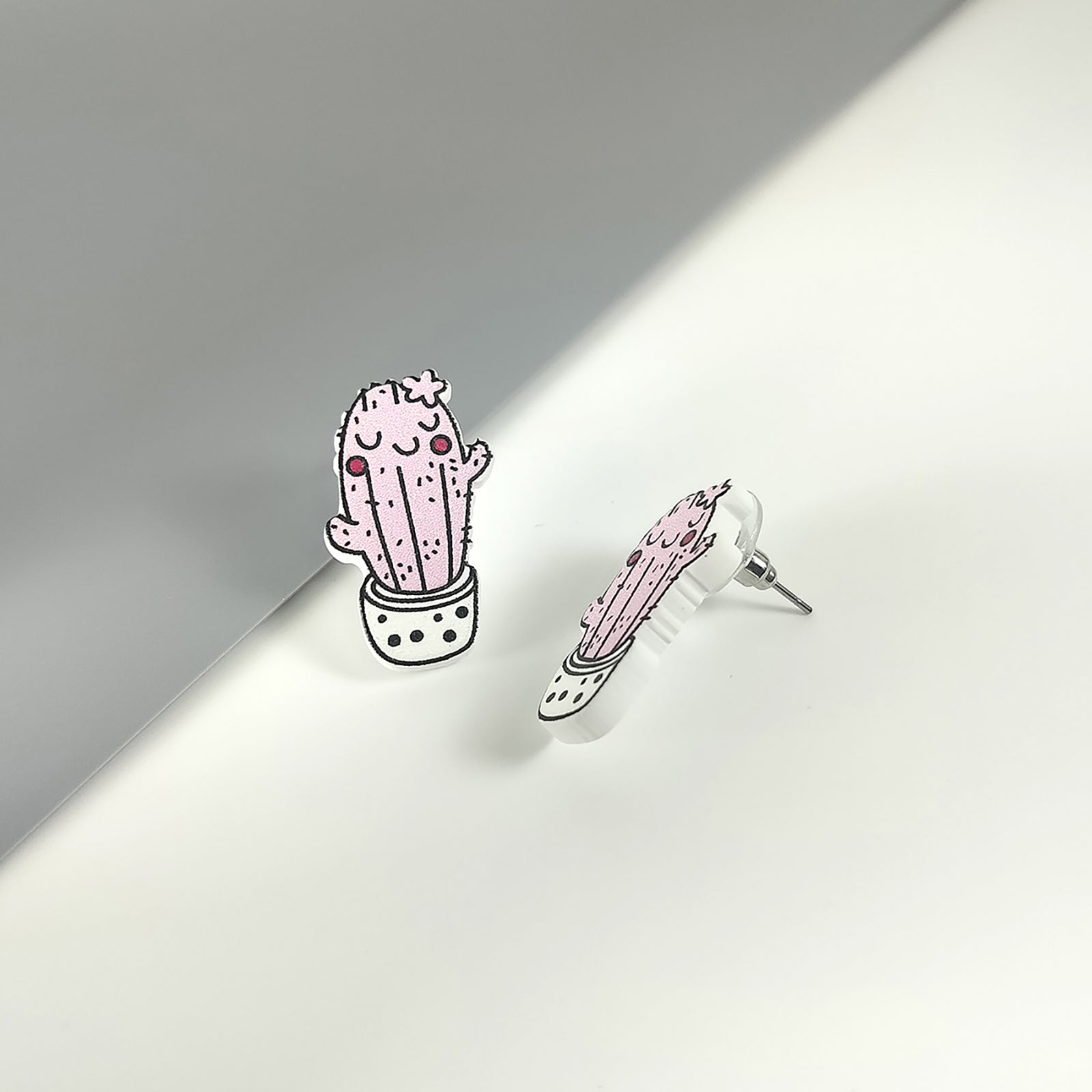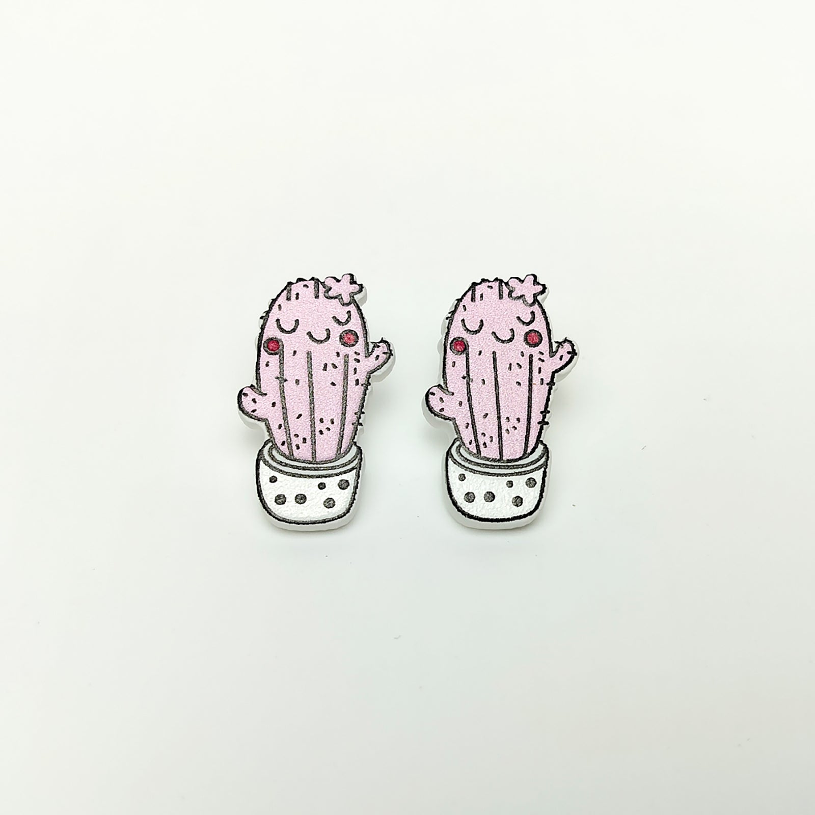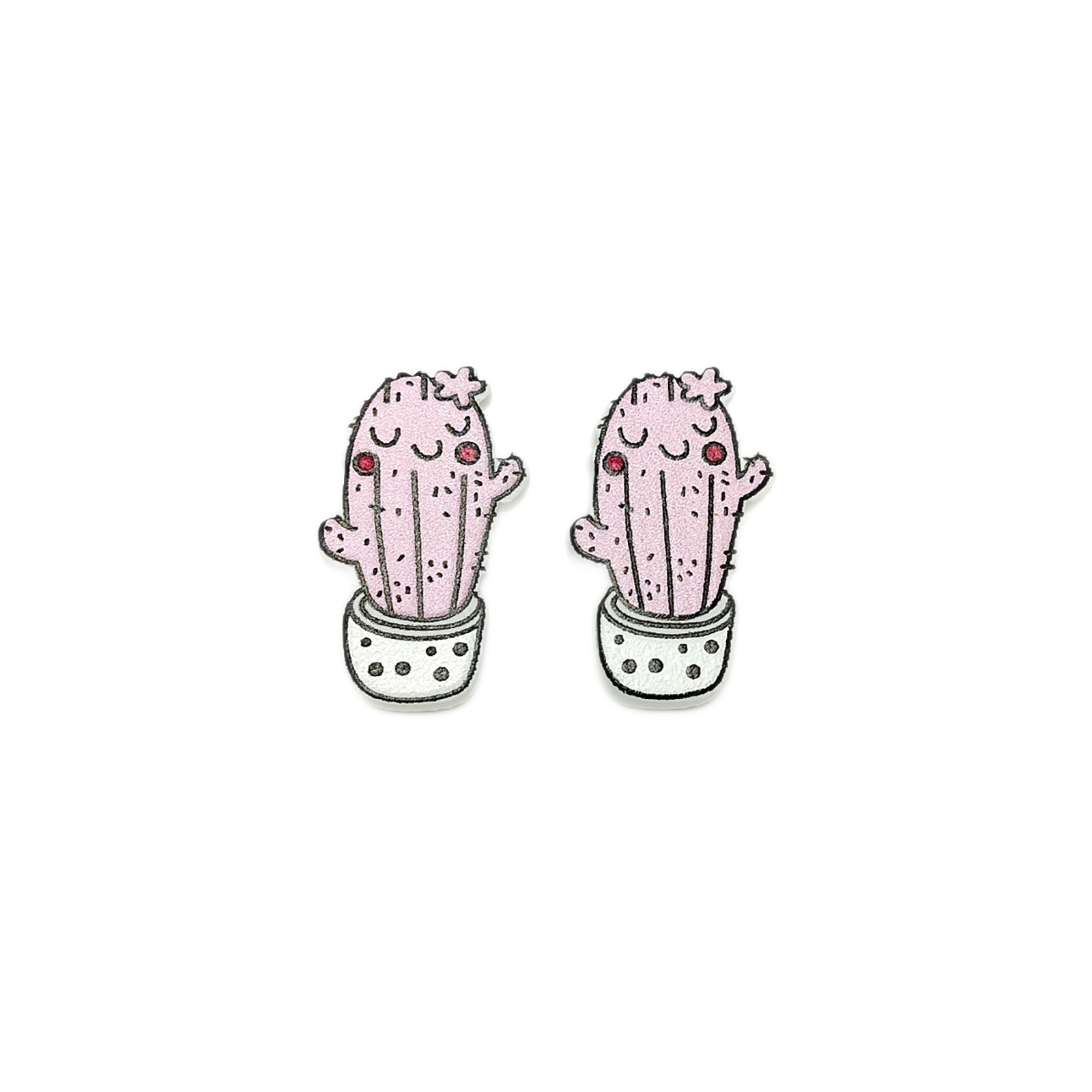 Sweet and whimsical, these tall pink cactus studs sit in a white polka dot pot. With their soft blush tone and playful design, they’re ideal for adding a fun, colorful accent to any outfit.