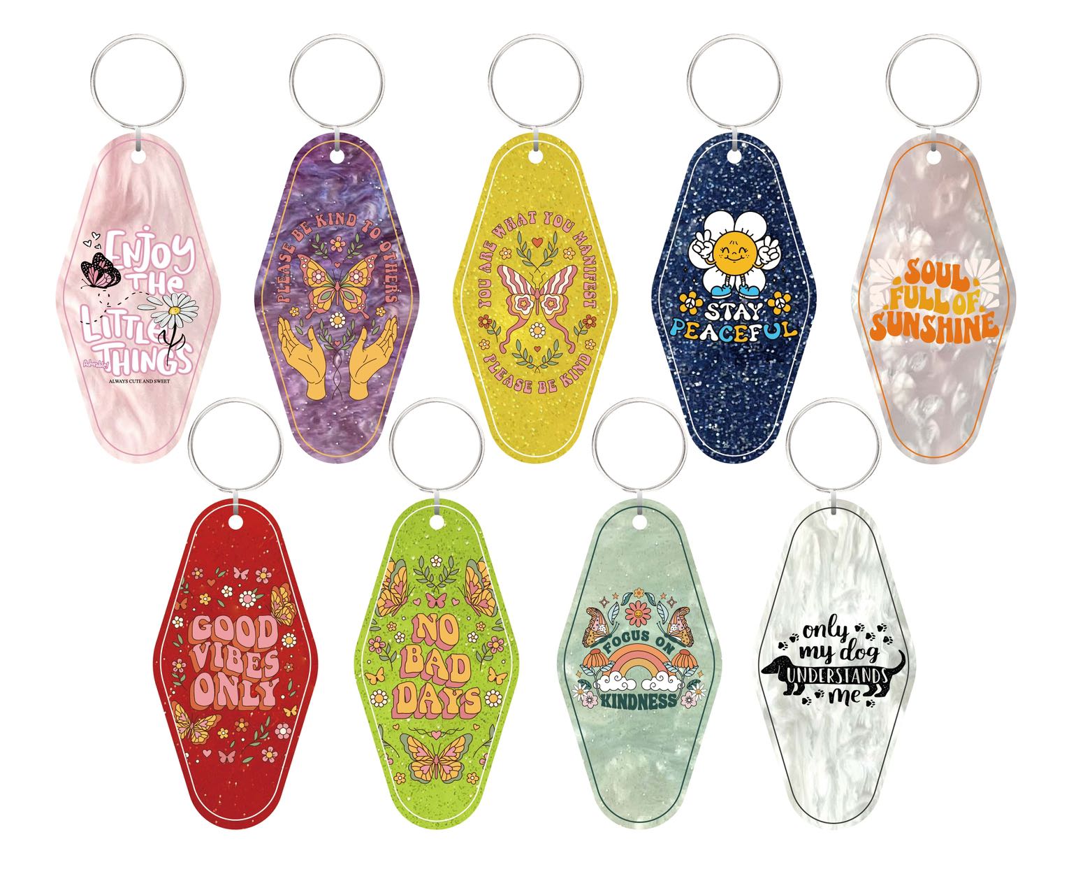 Evoke the nostalgia of classic roadside hotels with this charming motivational keychain with an adorable aesthetic. Crafted from sturdy acrylic that is sure to last, this butterfly keychain is a practical and stylish addition to your keyring.