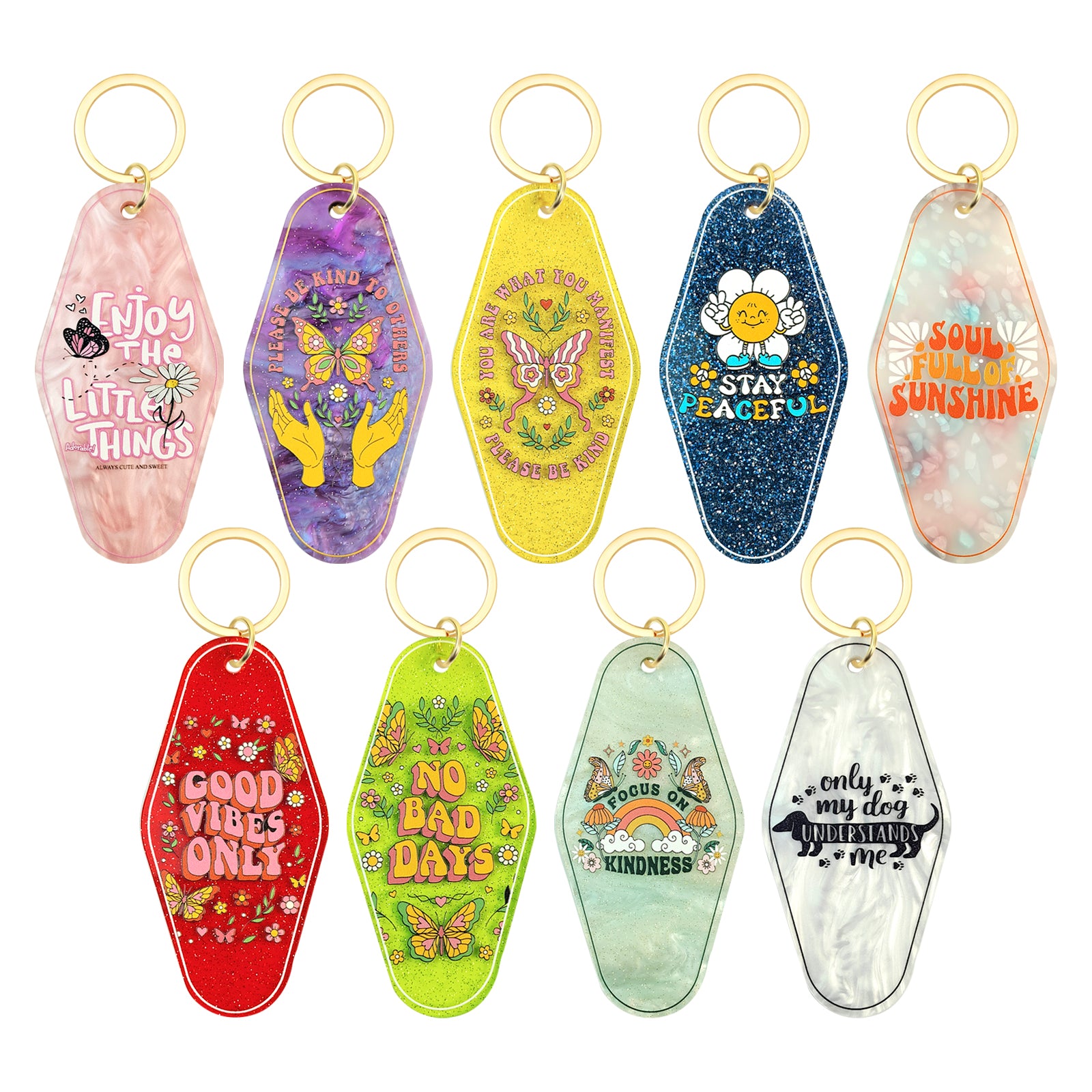Evoke the nostalgia of classic roadside hotels with this charming, vintage-inspired keychain with a boho aesthetic. Crafted from sturdy acrylic that is sure to last, this 70s-inspired motivational keychain is a practical and stylish addition to your keyring.
