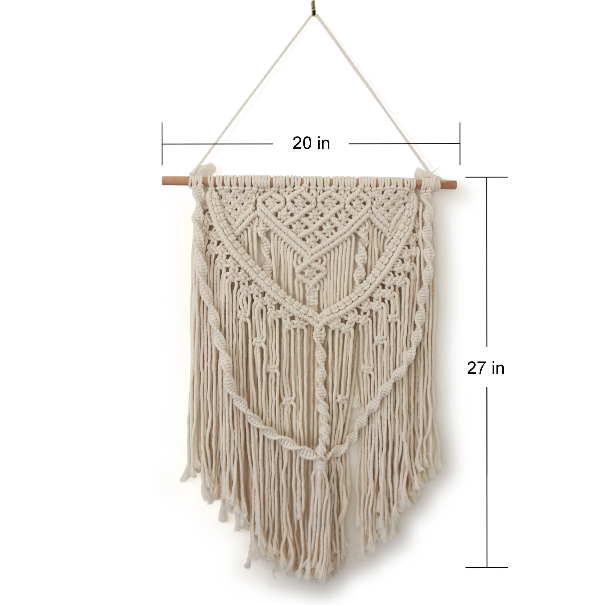 Made of 100% cotton and featuring an intricate design and long elegant tassels, this macrame is handmade and gorgeous. Make it seem like your room was professionally decorated when you hang this in your home. This beautifully braided piece of art is a natural cotton color of off-white, and on a wooden dowel and has a loop for hanging on the wall. It makes any room feel fancy and sophisticated. Whether you choose to hang it in your living room, bedroom, or nursery, this wall hanging will bring a feeling of elegance and boho style to any room.