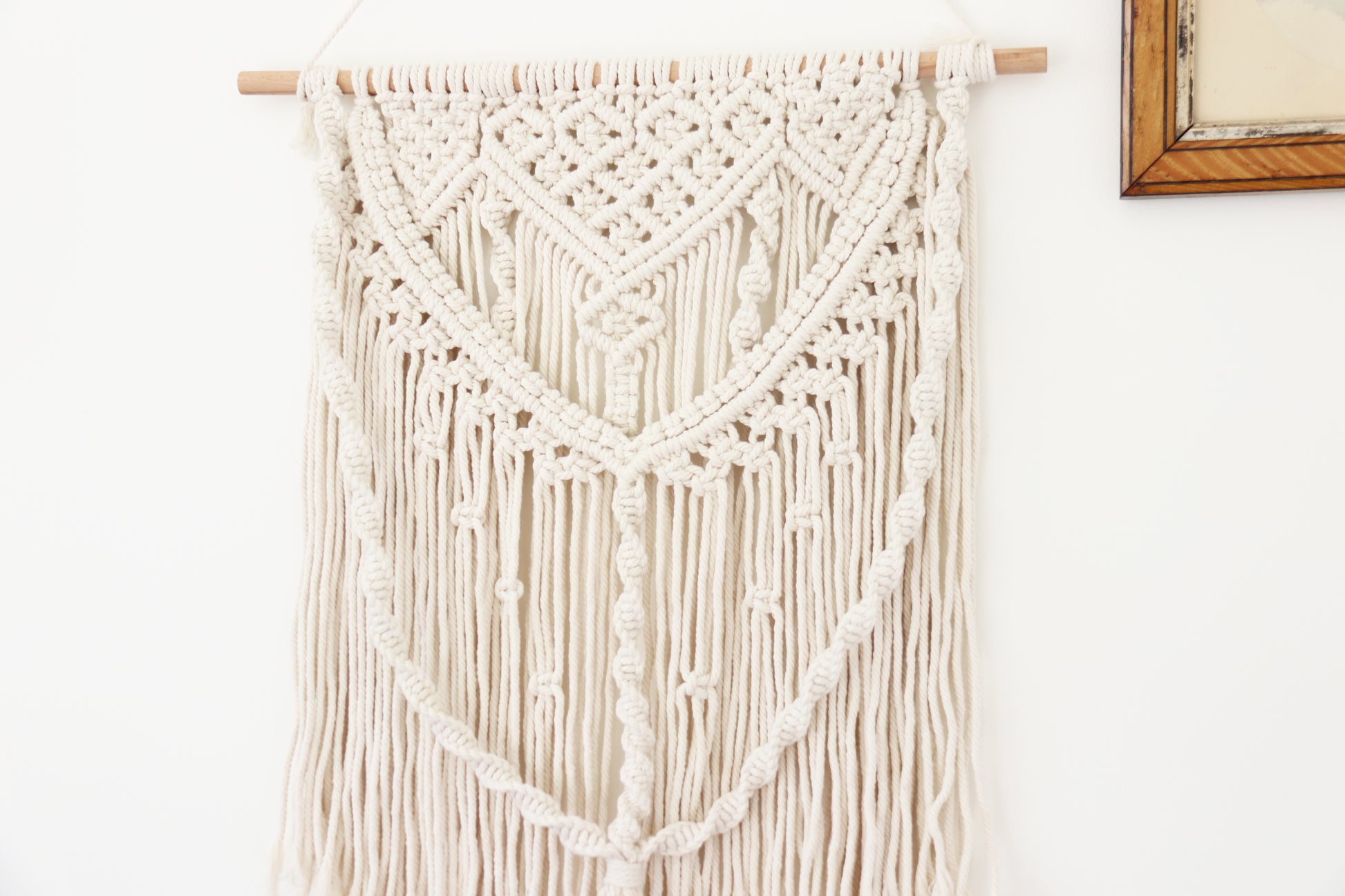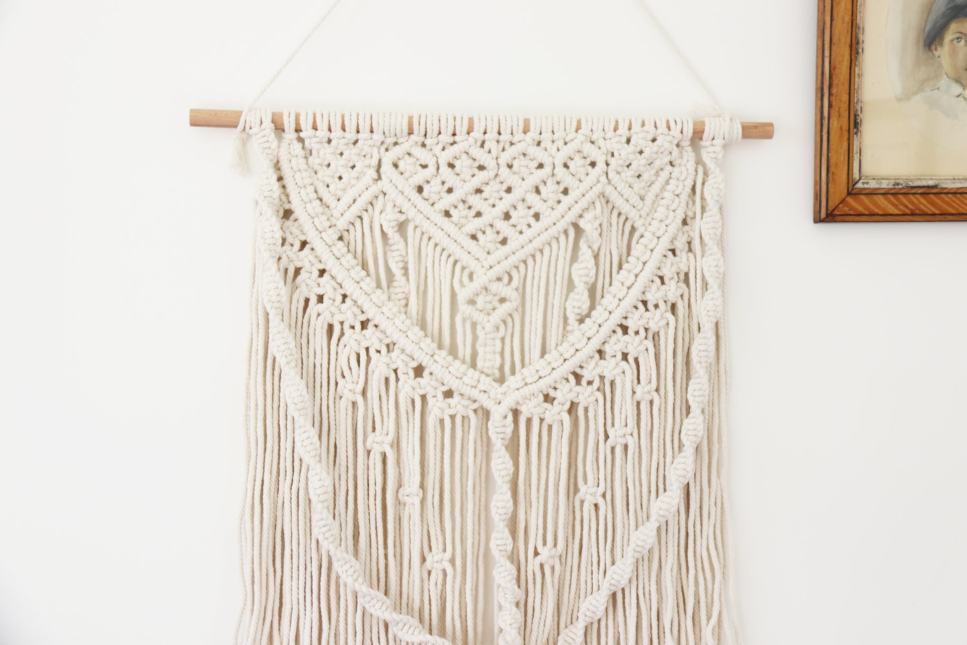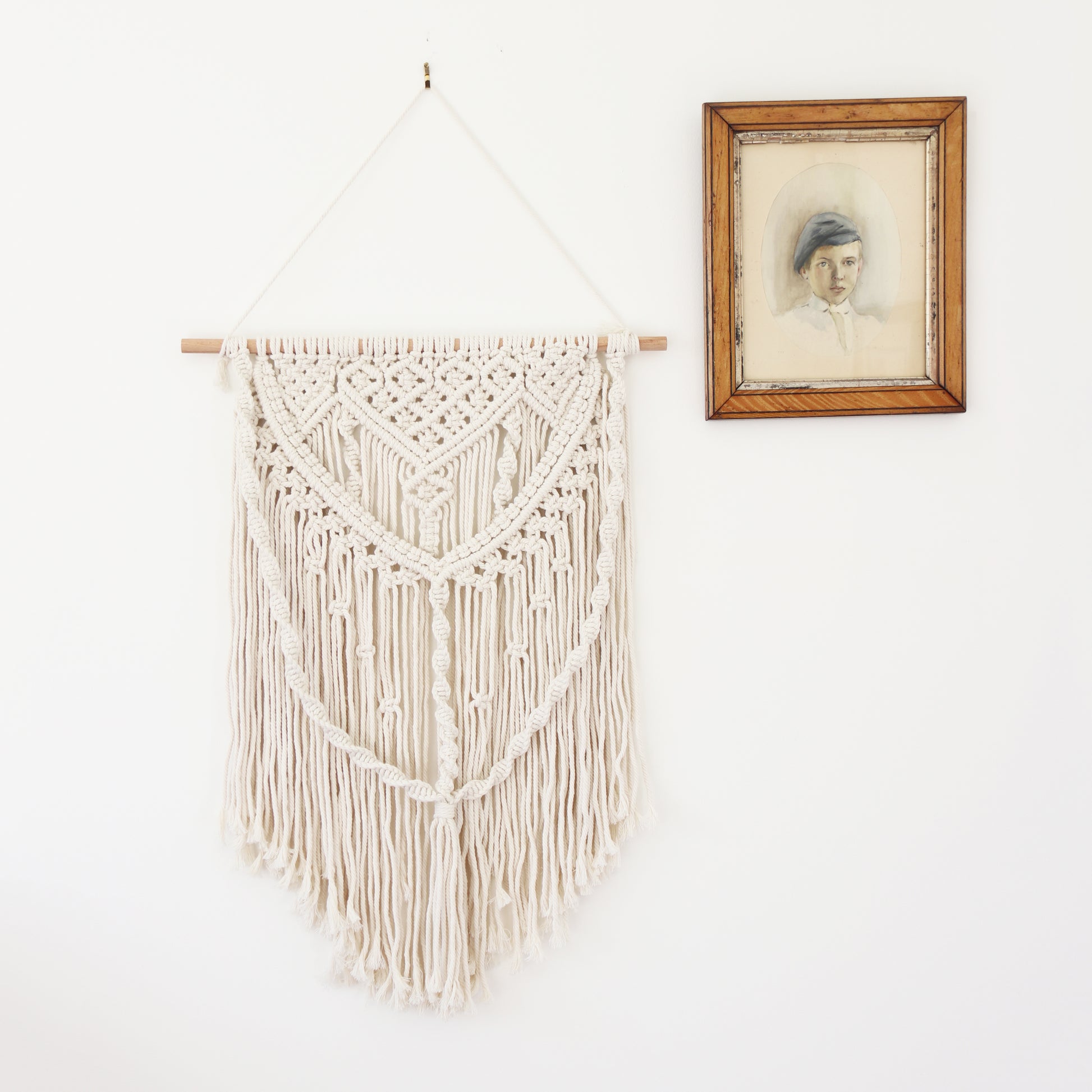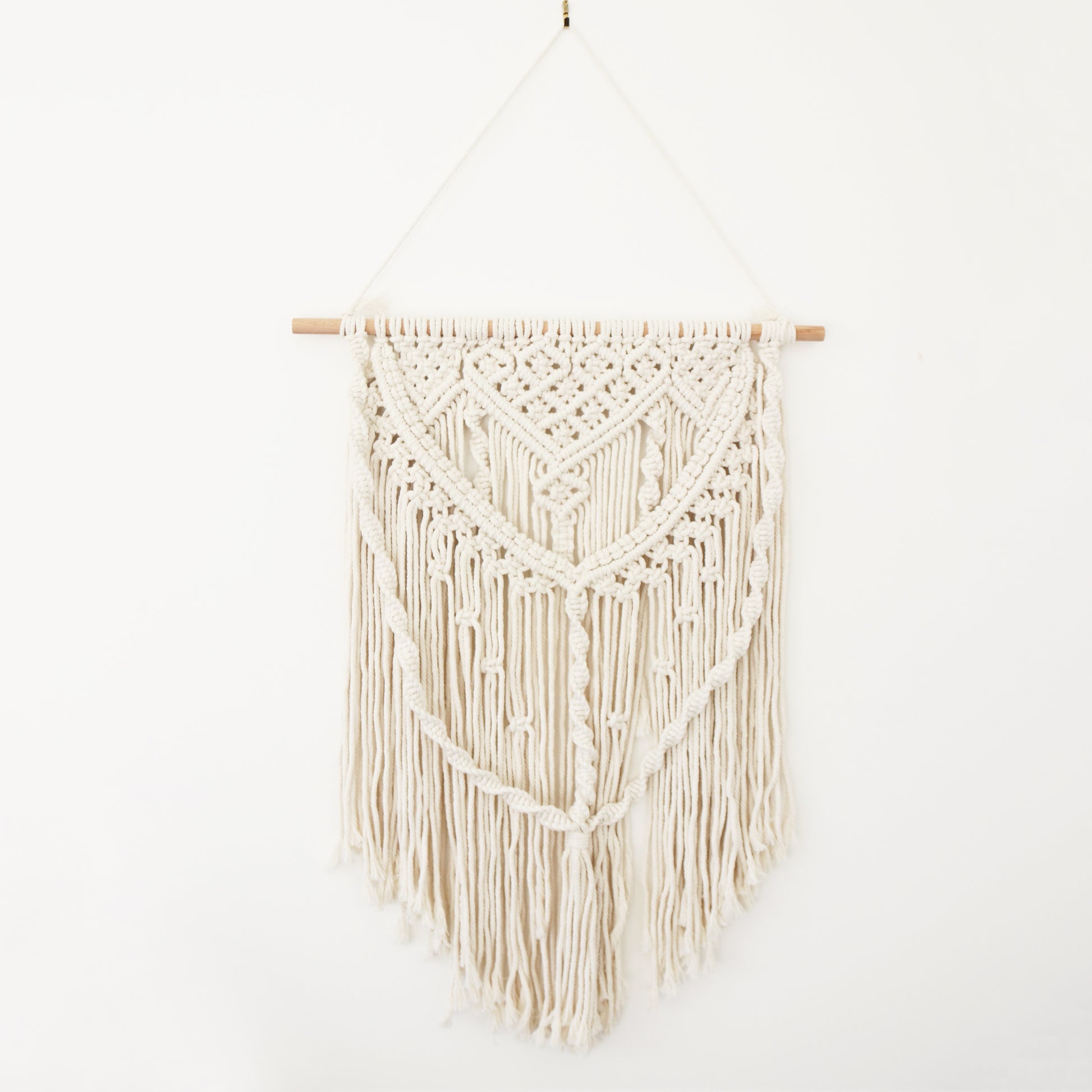 Please note: Macramé ships in a roll and will arrive appearing quite messy. You will need to spend some time unwinding the design from the supporting dowel. The process may appear overwhelming, but rest assured the design is knotted in place and will not come apart through the process of unwinding.