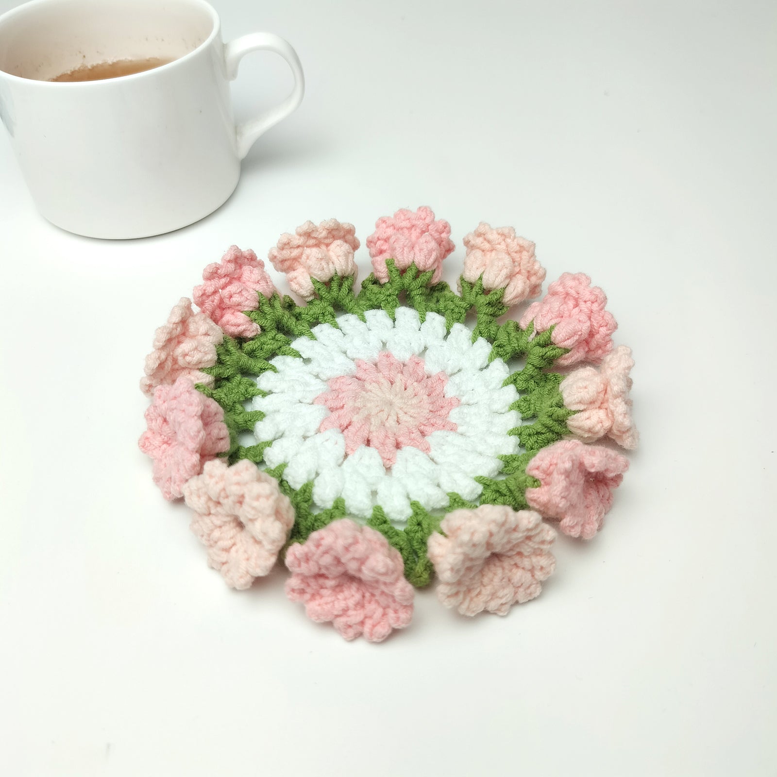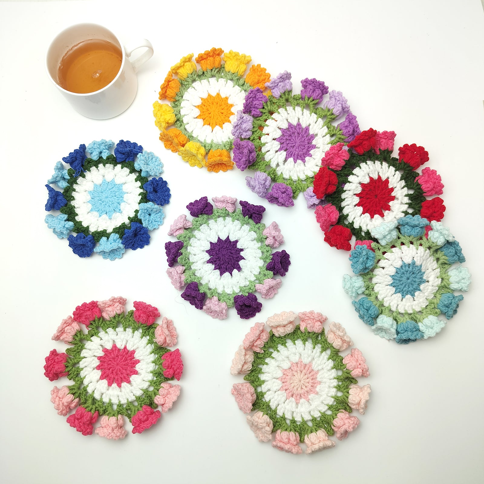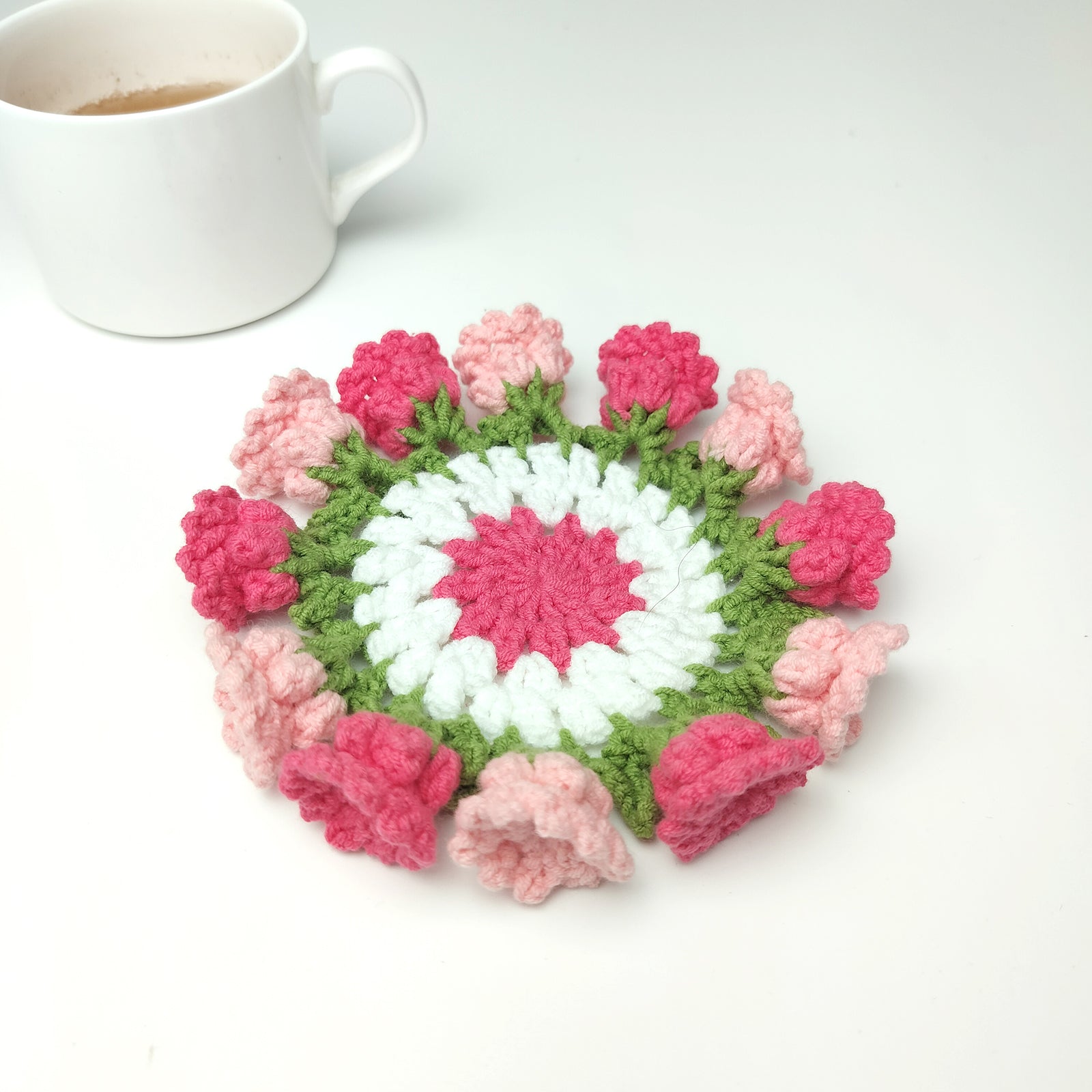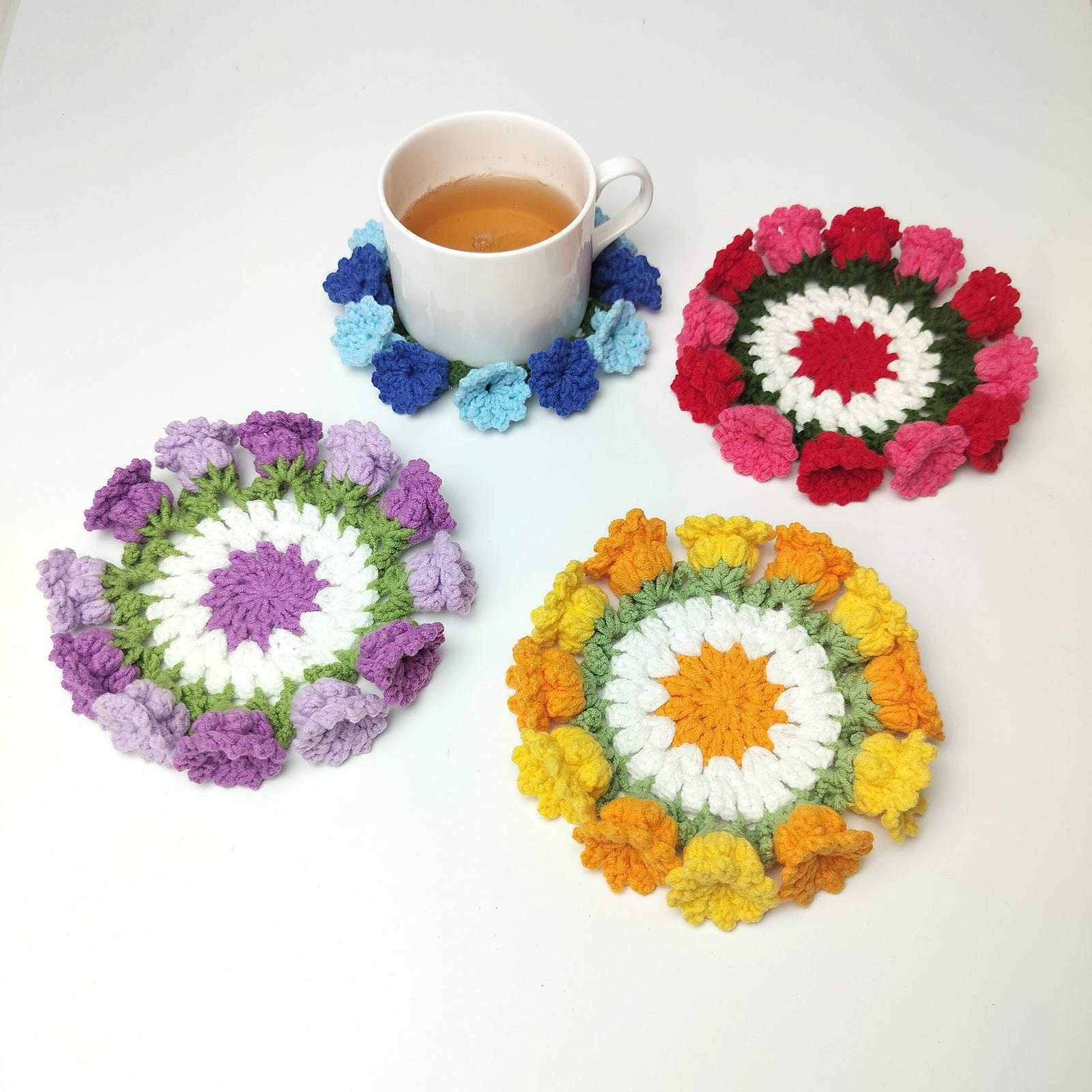 Carefully crafted from soft yarn, each coaster features a charming floral design that's perfect for holding your favorite mug, teacup, or cold drink.