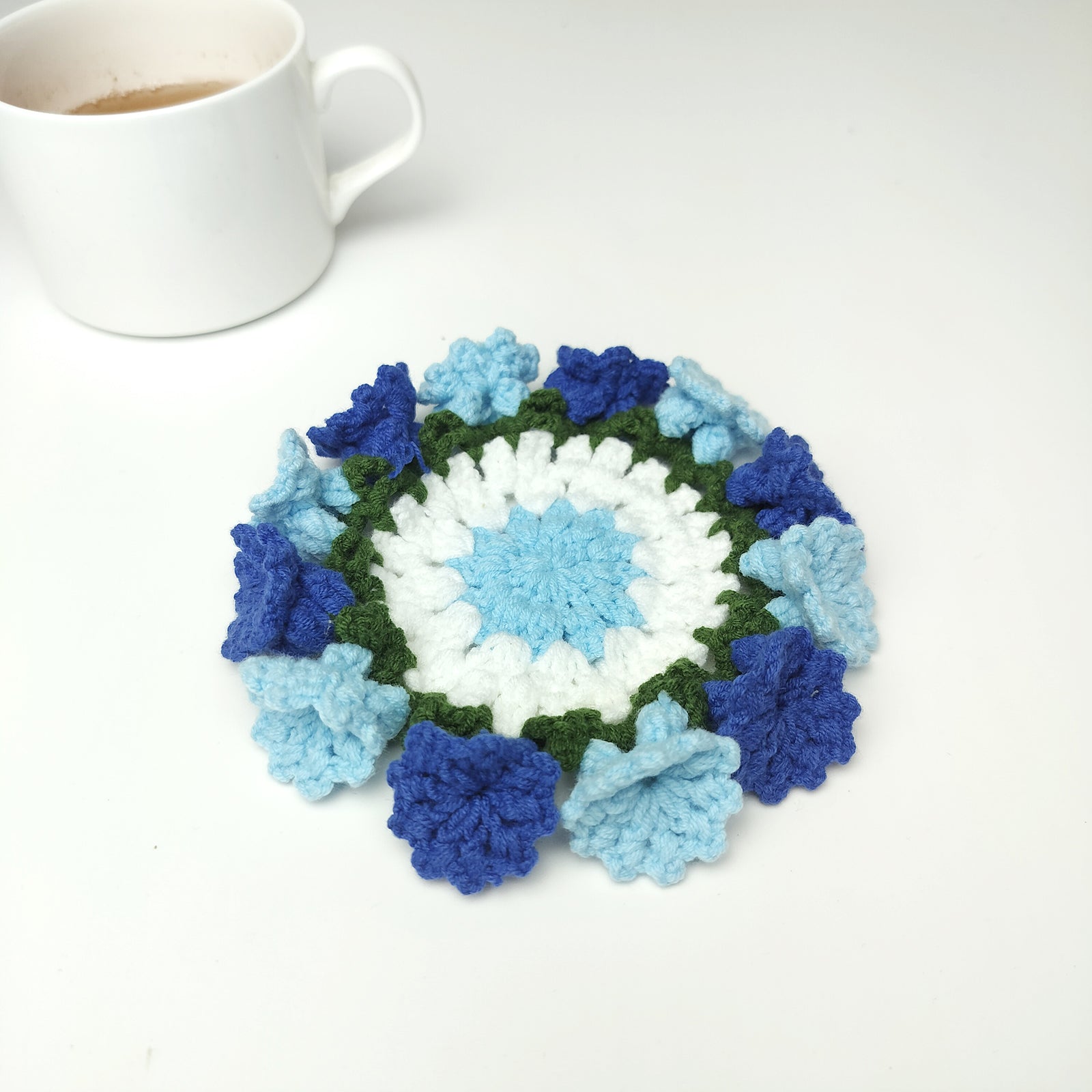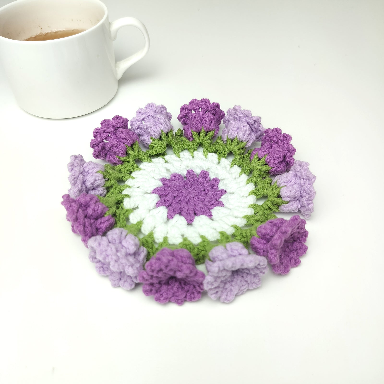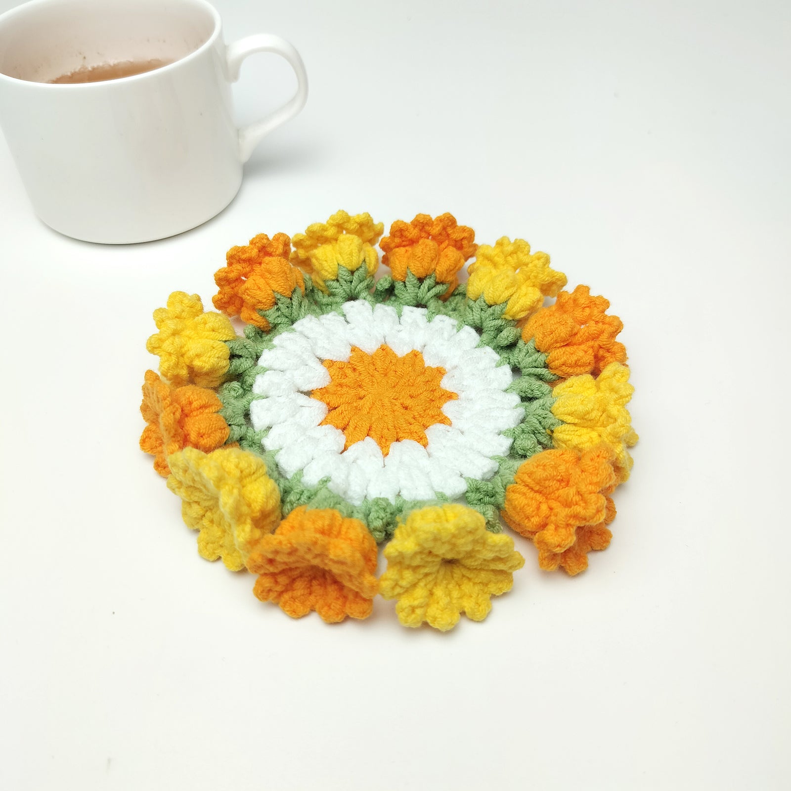 Carefully crafted from soft yarn, each coaster features a charming floral design that's perfect for holding your favorite mug, teacup, or cold drink.