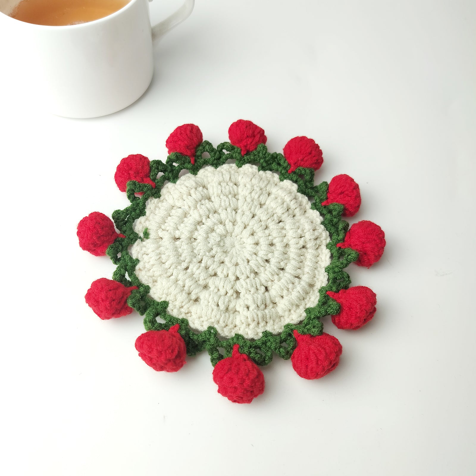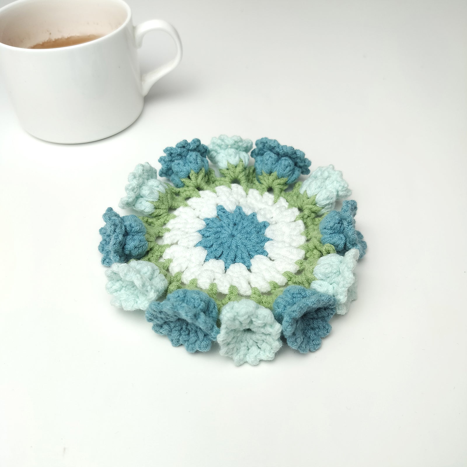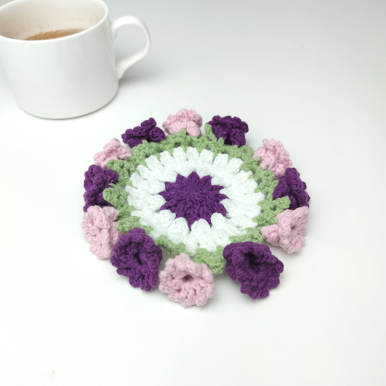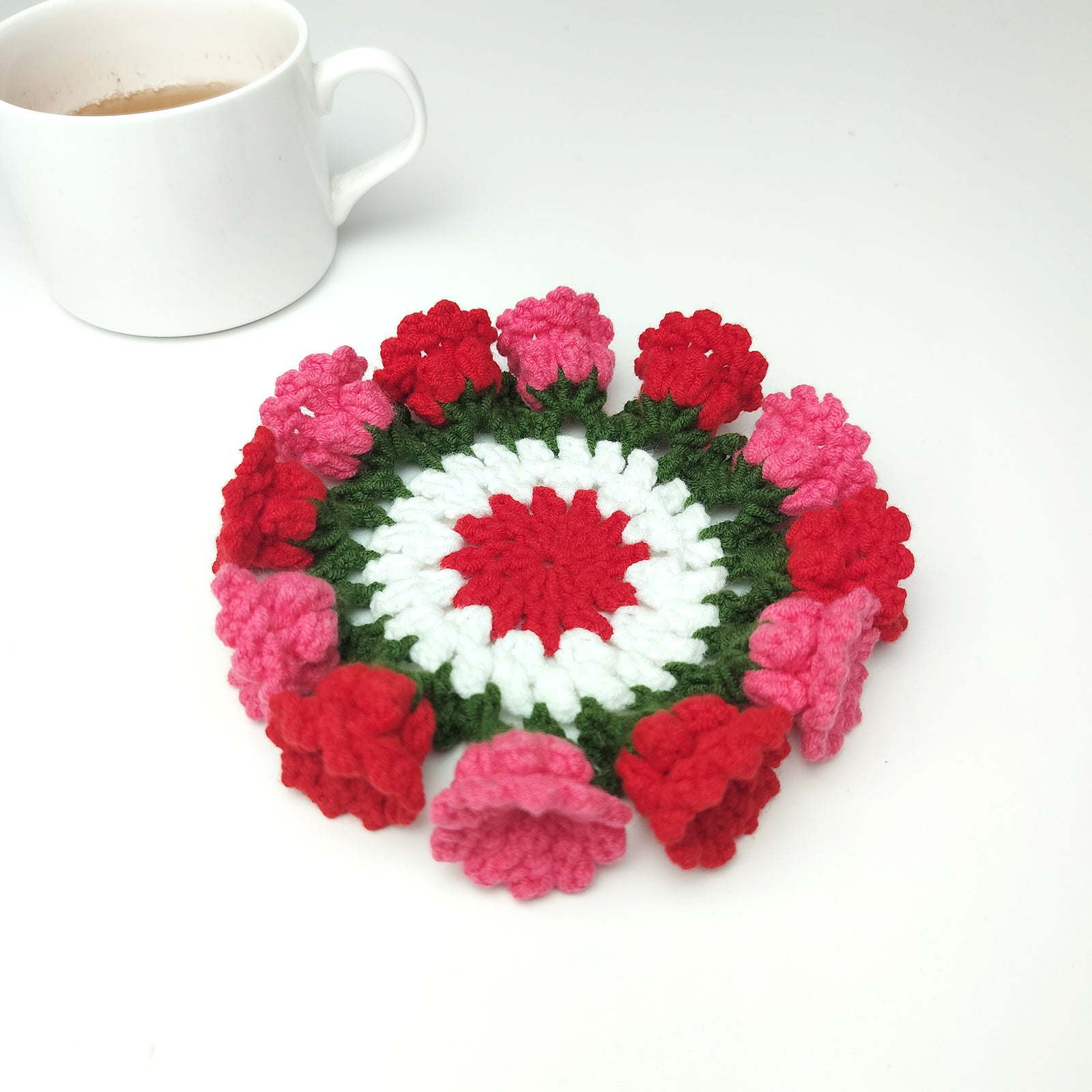 Carefully crafted from soft yarn, each coaster features a charming floral design that's perfect for holding your favorite mug, teacup, or cold drink.