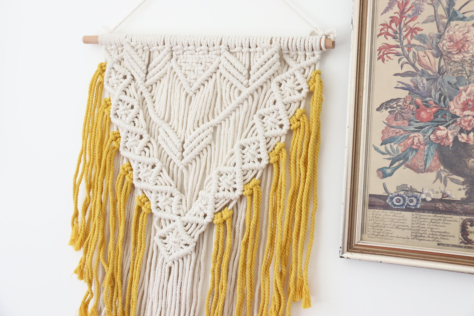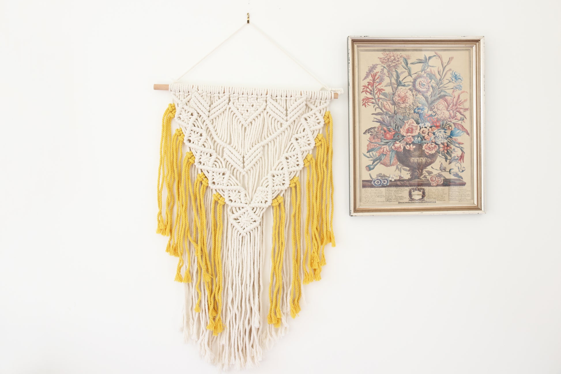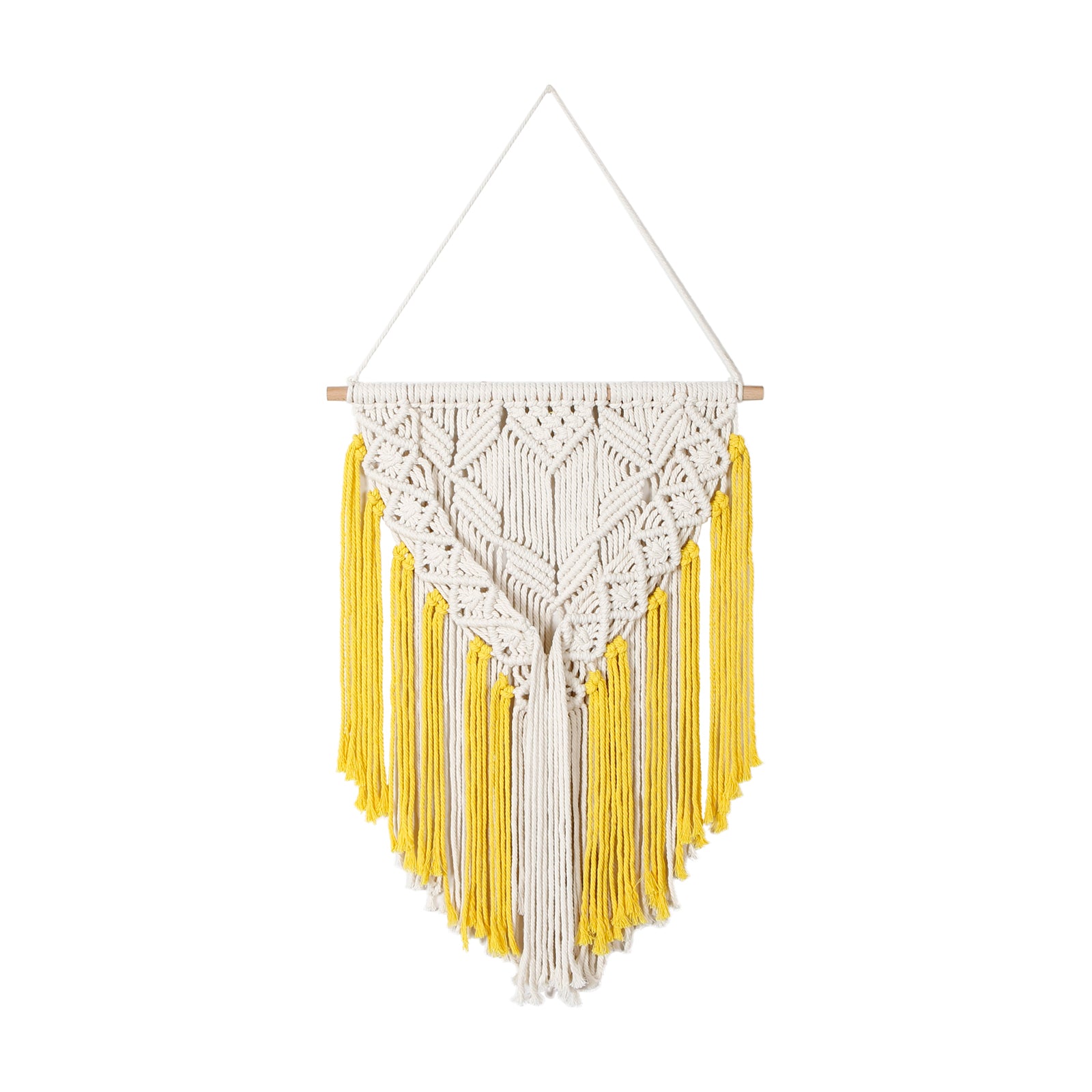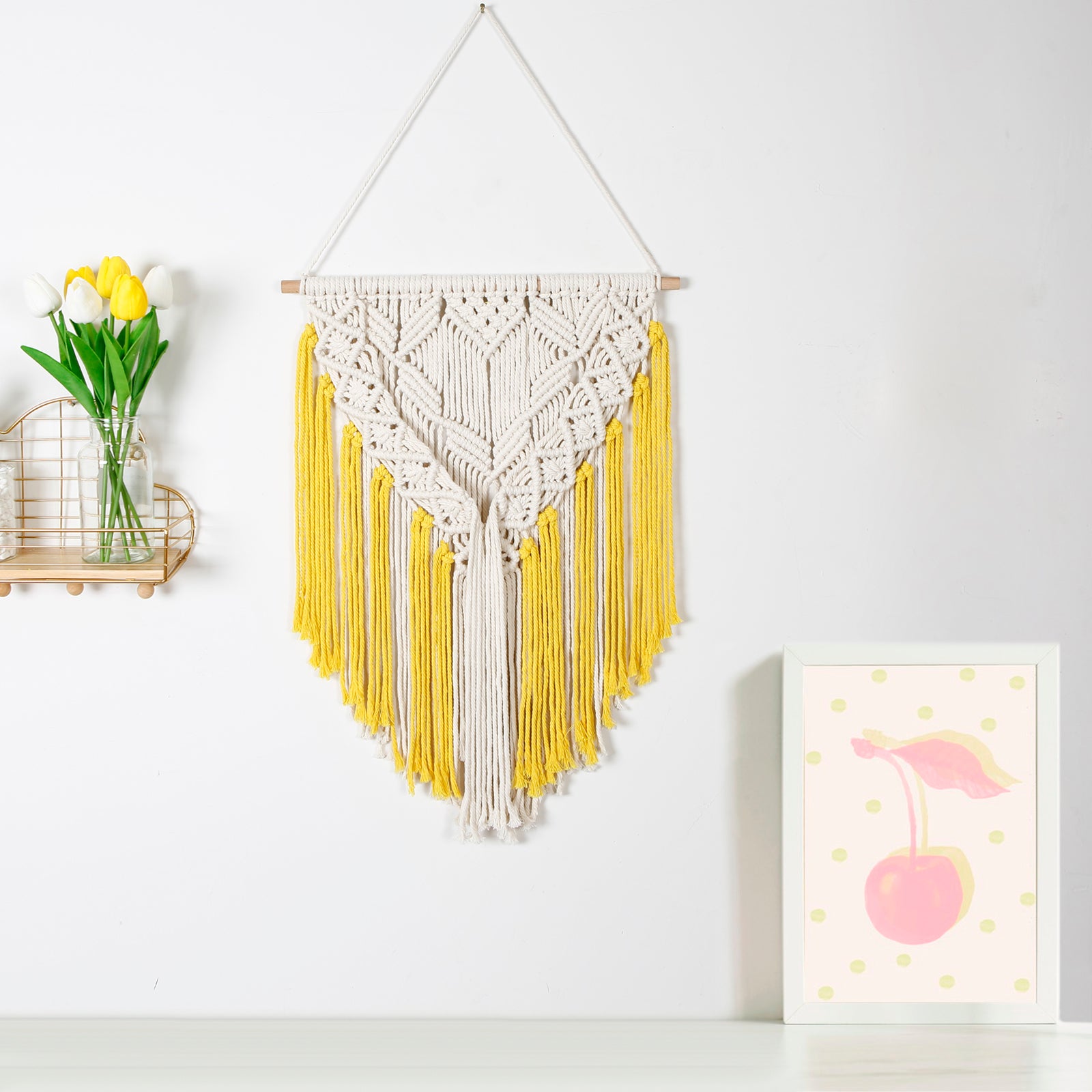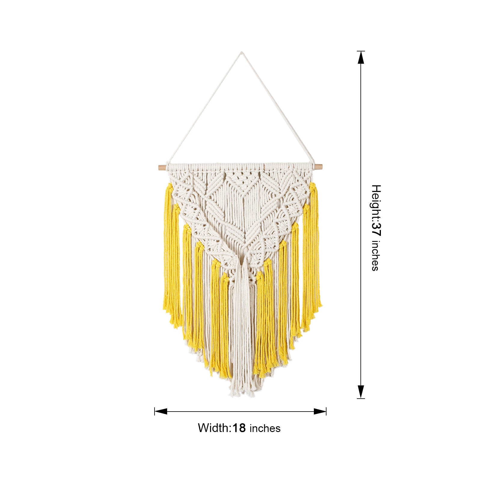 Made of 100% cotton and featuring an intricate design and long elegant tassels, this macrame is handmade and gorgeous. Make it seem like your room was professionally decorated when you hang this in your home. This beautifully braided piece of art is a natural cotton color of off-white and yellow, and on a wooden dowel and has a loop for hanging on the wall. It makes any room feel fancy and sophisticated. Whether you choose to hang it in your living room, bedroom, or nursery, this wall hanging will bring a feeling of elegance and boho style to any room.