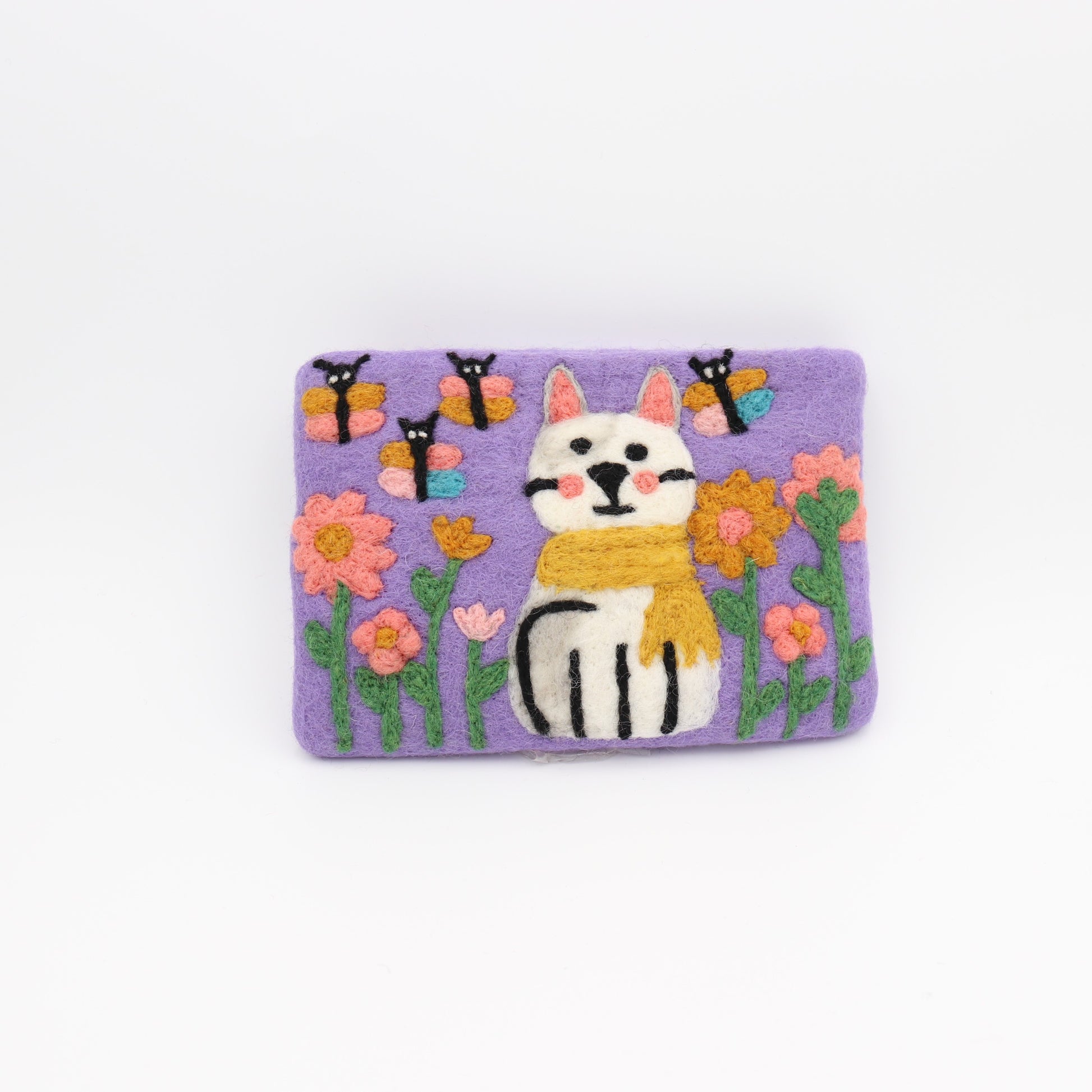 Say hello to the scarf-kitty in a flower field, complete with friendly bees. This cheerful wool-felt zipper pouch brings spring vibes year-round and keeps the little things organized—coins, keys, lip balm, earbuds, and more.