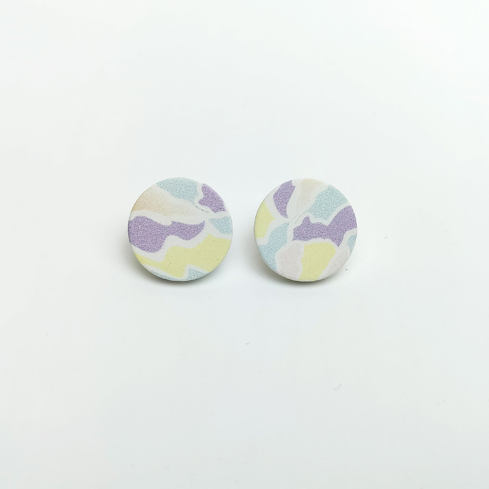 Like tiny canvases for your ears, these round stud earrings feature soft brushstroke patterns in pastel shades of lilac, butter yellow, blush pink, and mint.