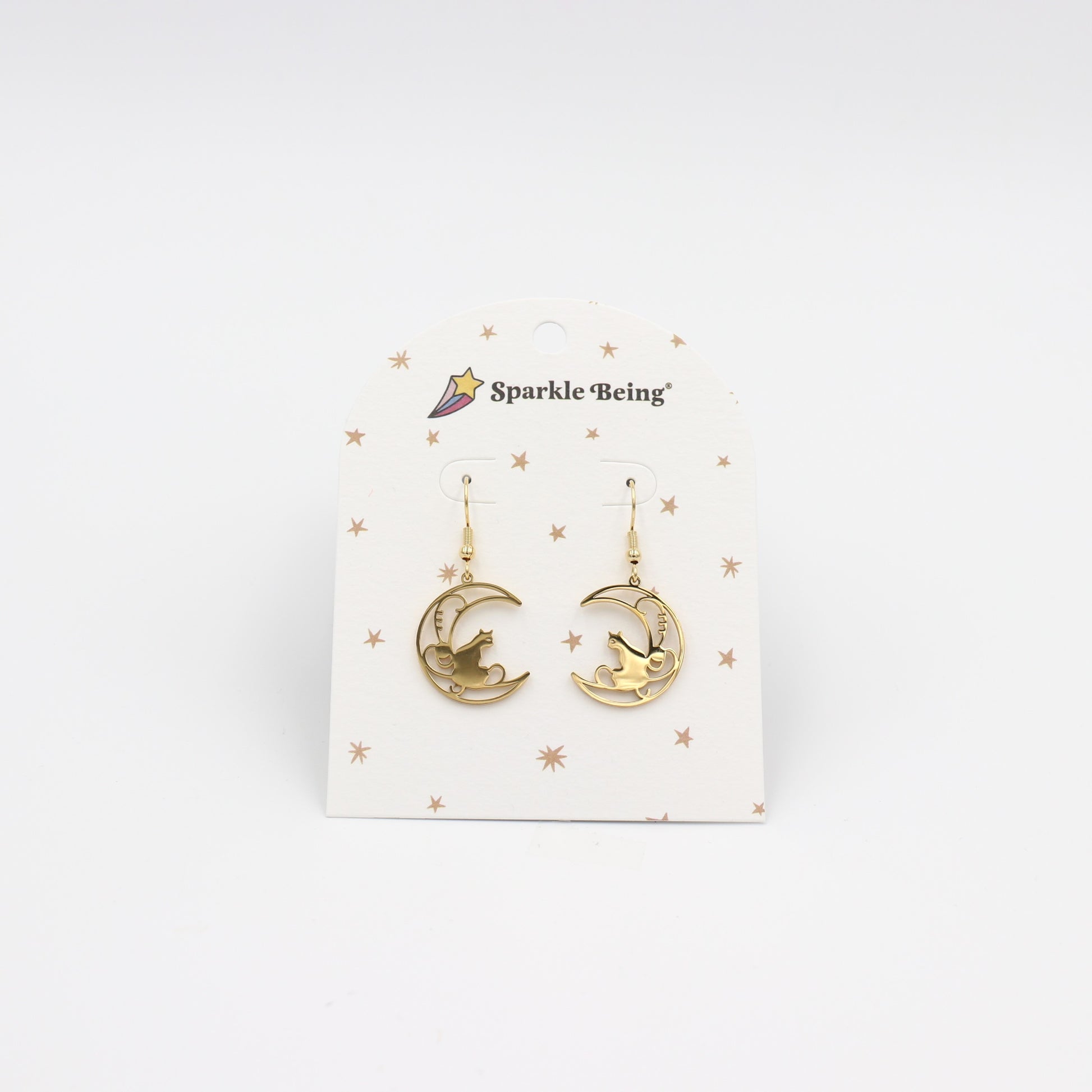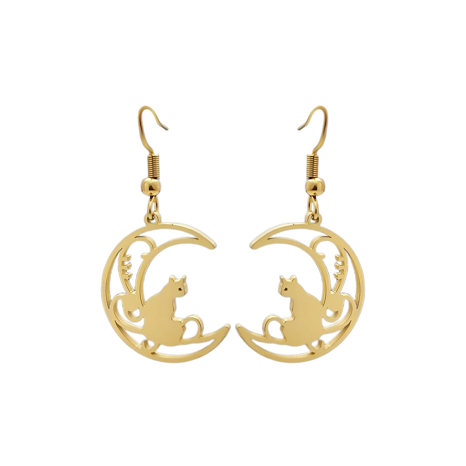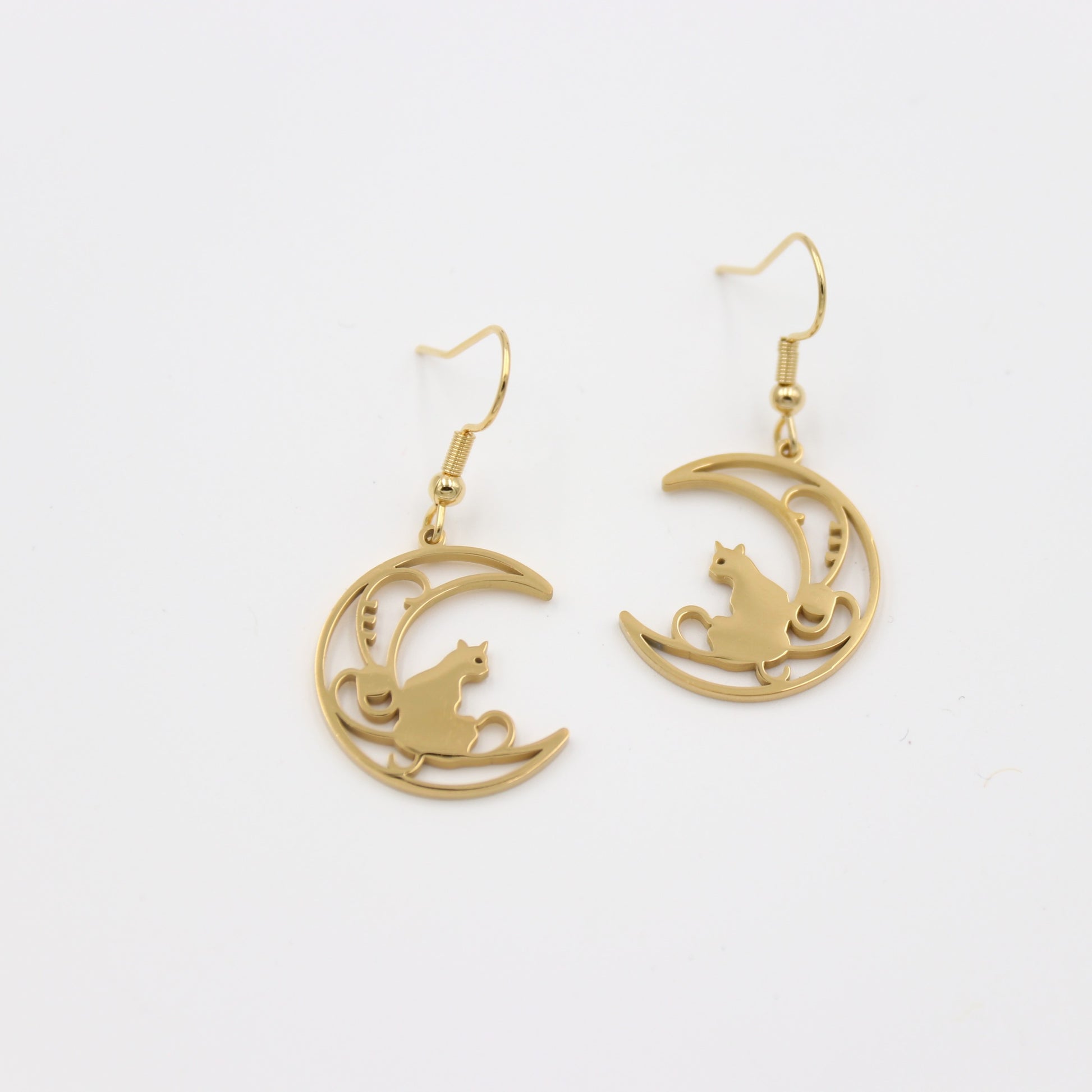 Stainless Steel Drop Earrings - Crescent Moon and Cat
