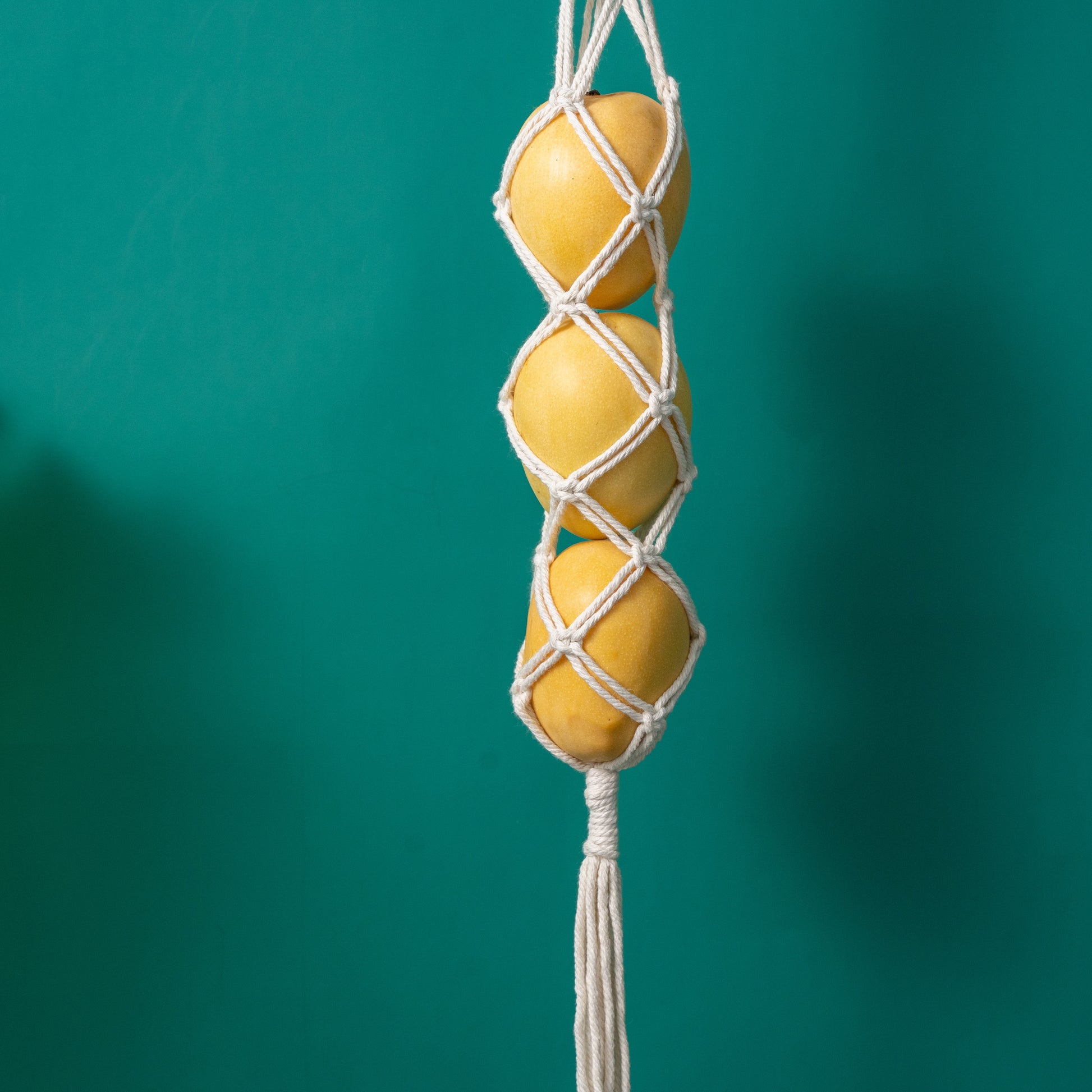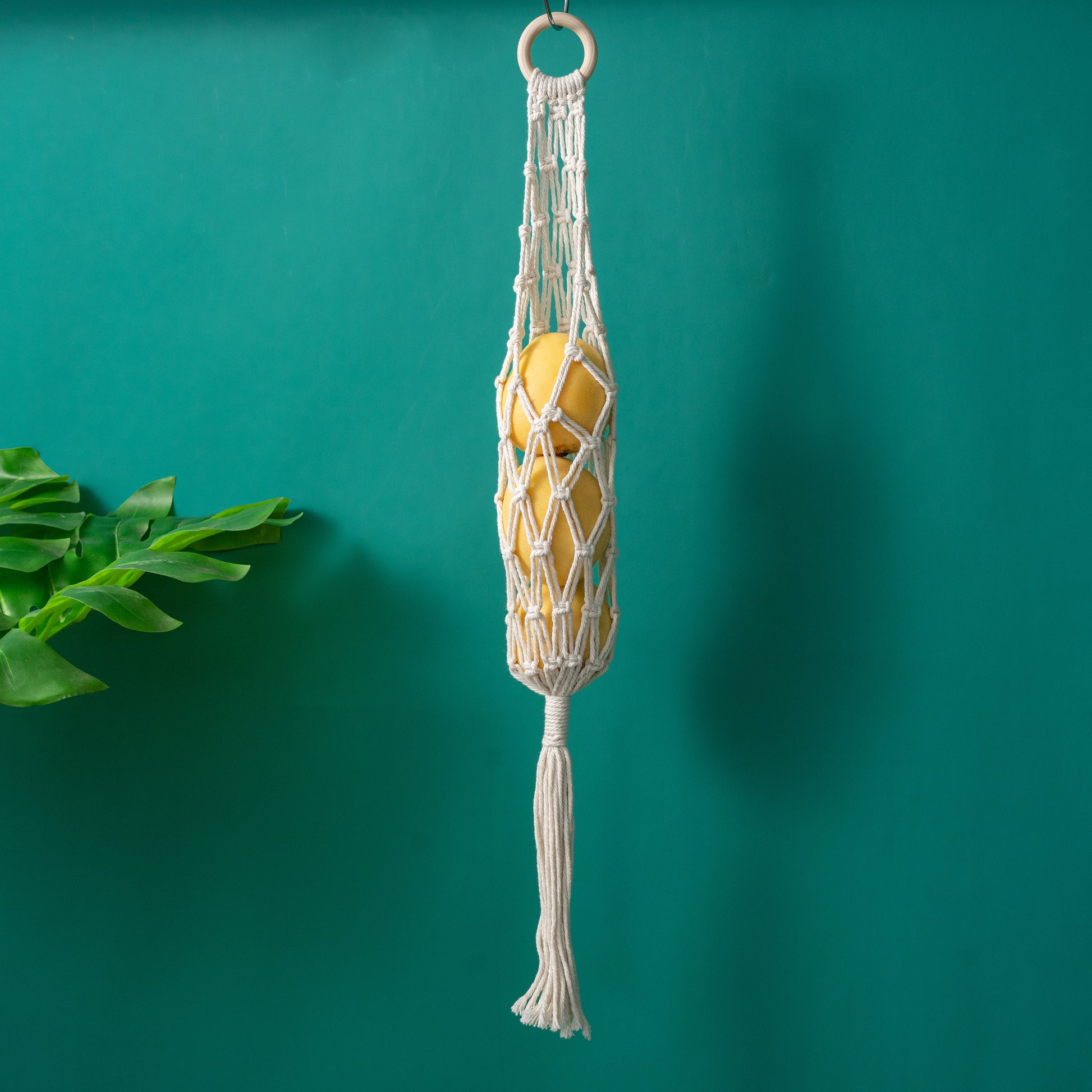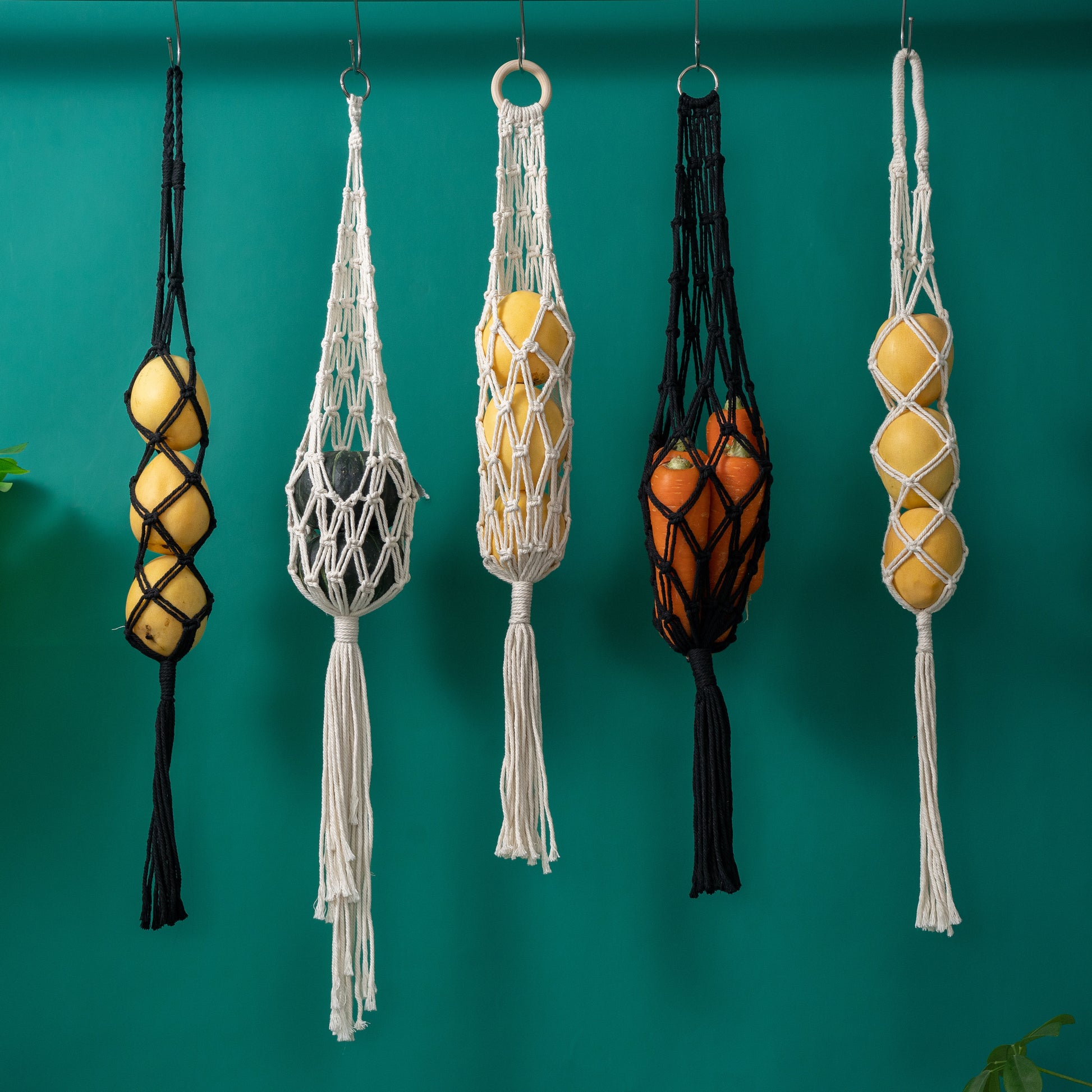 This macrame wall hanging is the perfect solution for organizing your fruits and vegetables. Made of high-quality cotton, it's great for storing onions, potatoes, and other produce. The wall hanging features three bags that can be used separately for additional storage options.